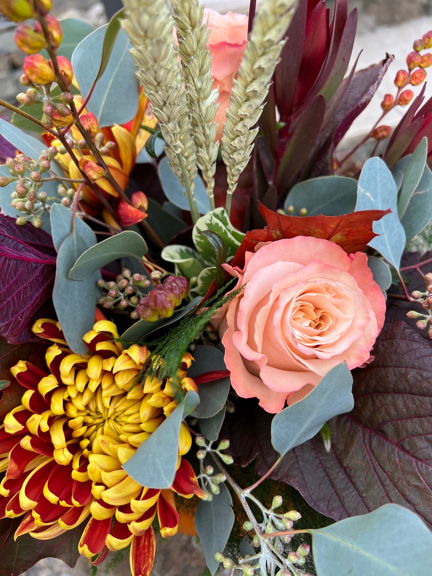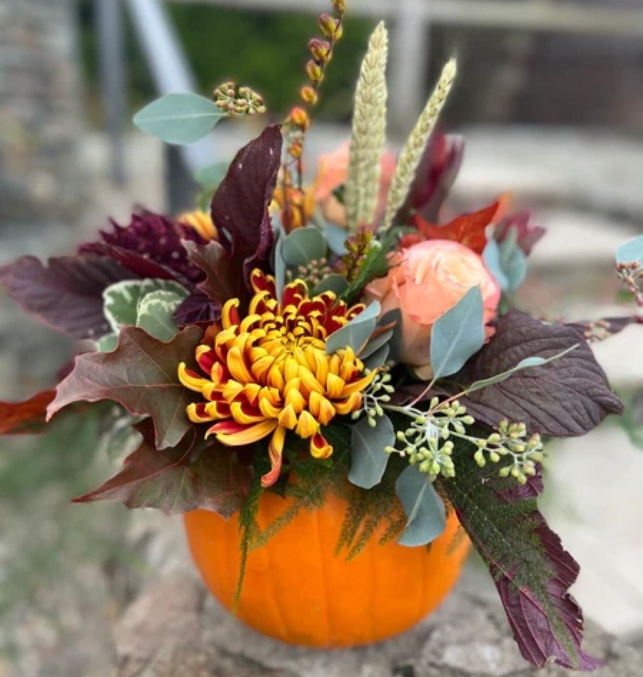 Floral arrangement created within a pumpkin using an array of playful autumn-colours.