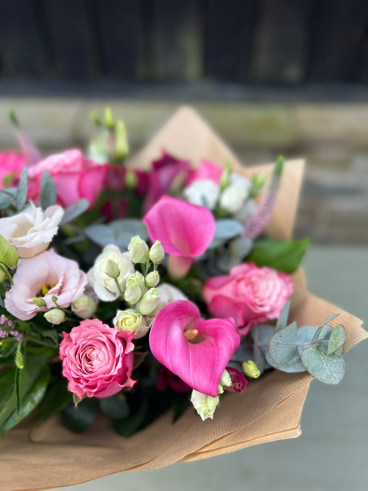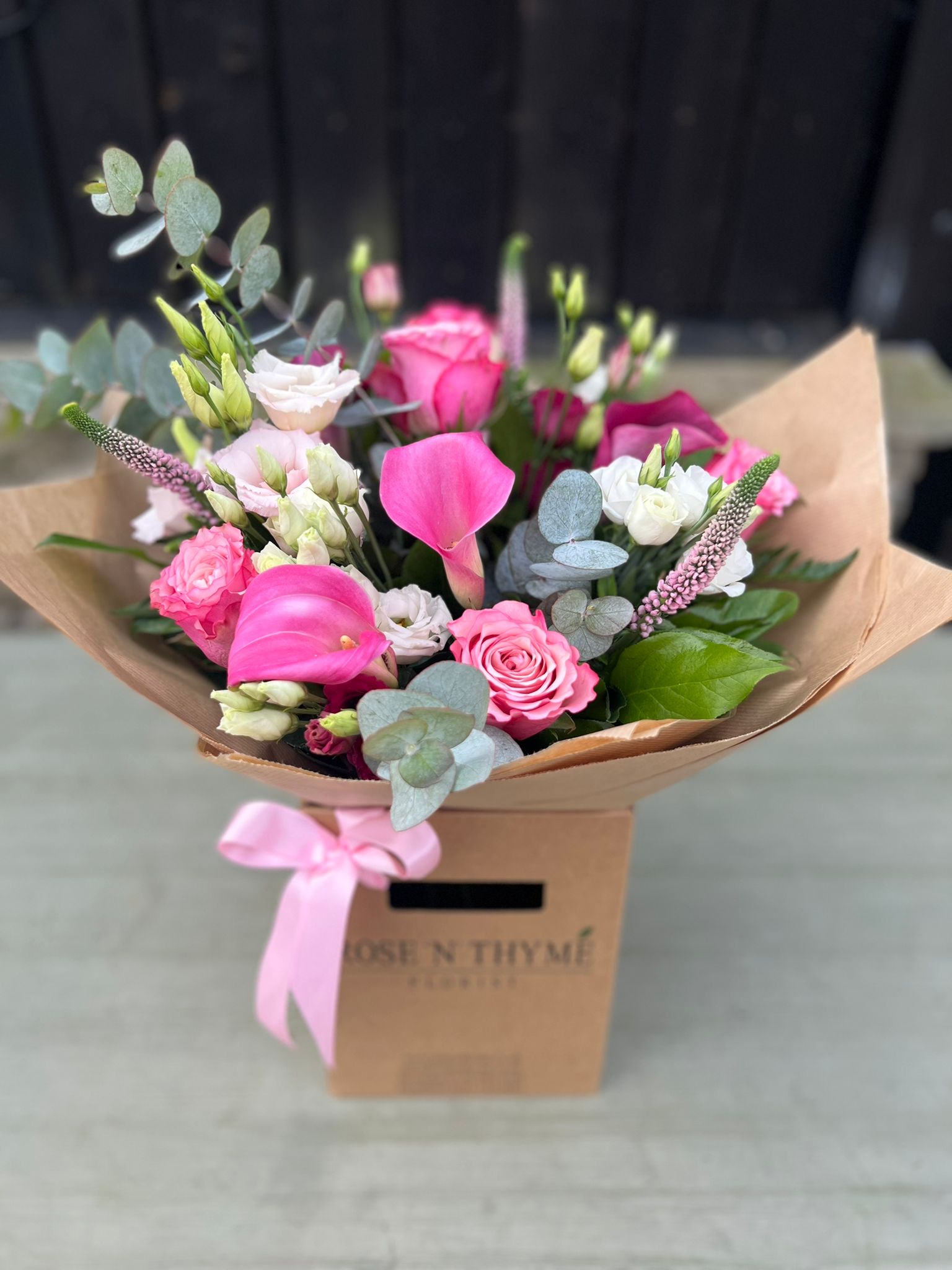 Pretty in pink, Sofia is created with beautiful seasonal flowers including calla lily, pink roses, wax flowers, Eustoma, veronica and finished with eucalyptus and complimenting foliage's.